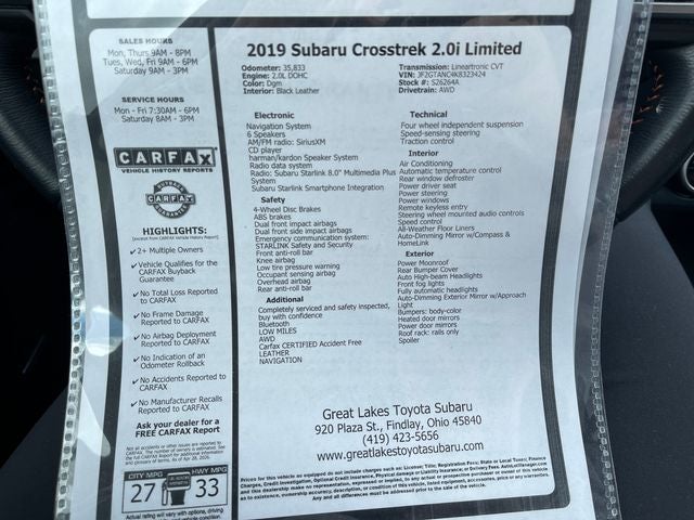 Completely serviced and safety inspected, buy with confidence, Bluetooth®, LOW MILES, AWD, Carfax CERTIFIED Accident Free, LEATHER, NAVIGATION. 2019 Subaru Crosstrek 2.0i Limited Dgm AWD Lineartronic CVT 2.0L DOHC