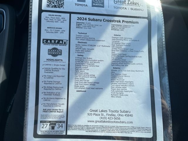 Completely serviced and safety inspected, buy with confidence, Purchased BRAND NEW here at Great Lakes Subaru, all service records available!, Bluetooth®, MOONROOF, ONE OWNER, AWD, Carfax CERTIFIED Accident Free. 2024 Subaru Crosstrek Premium Crystal White Pearl AWD Lineartronic CVT 2.0L 4-Cylinder DOHC 16V
