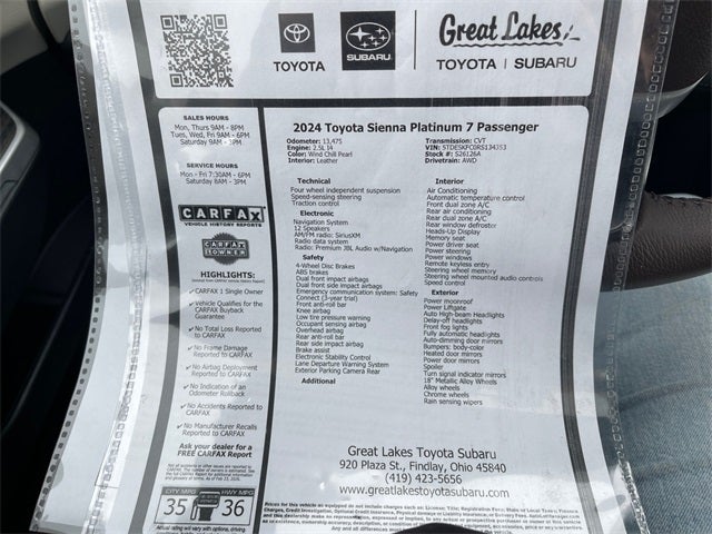 Completely serviced and safety inspected, buy with confidence, Purchased BRAND NEW here at Great Lakes Toyota, all service records available!, Bluetooth®, LOW MILES, 4WD, Local Trade, MOONROOF, ONE OWNER, AWD, Carfax CERTIFIED Accident Free, LEATHER, NAVIGATION. 2024 Toyota Sienna Platinum Wind Chill Pearl AWD CVT 2.5L I4